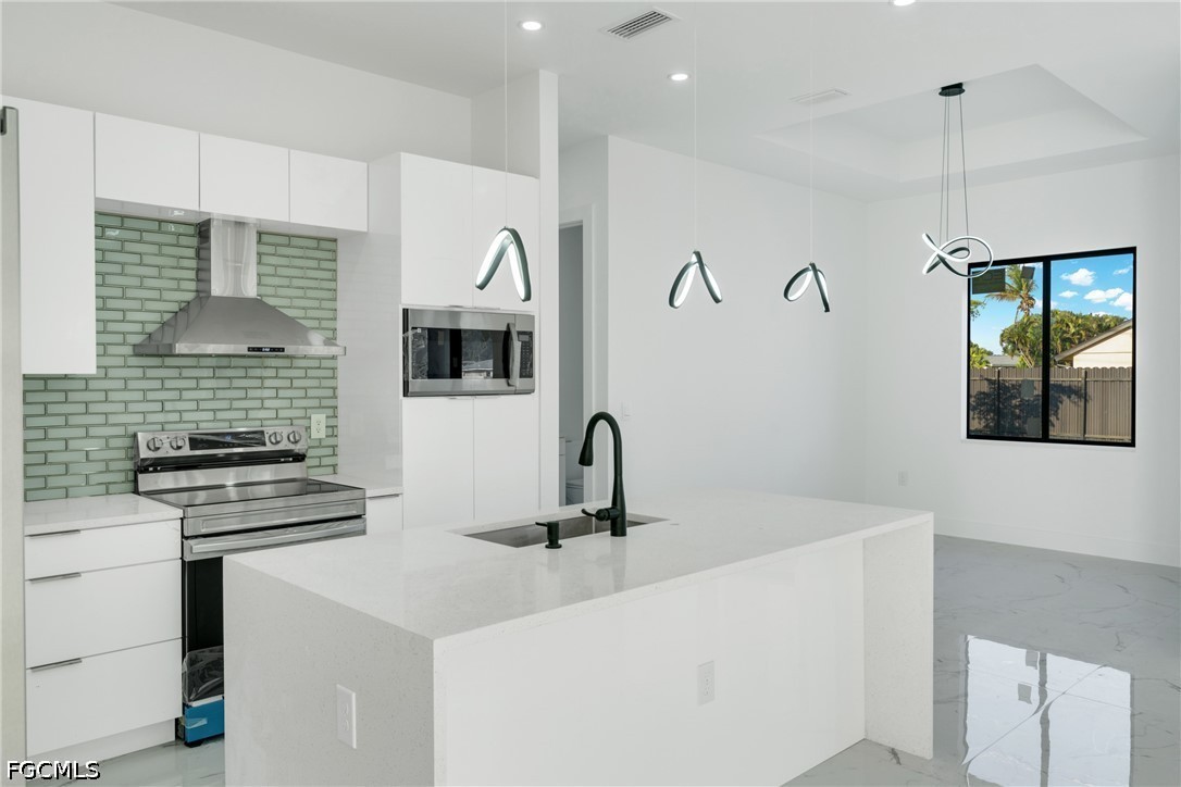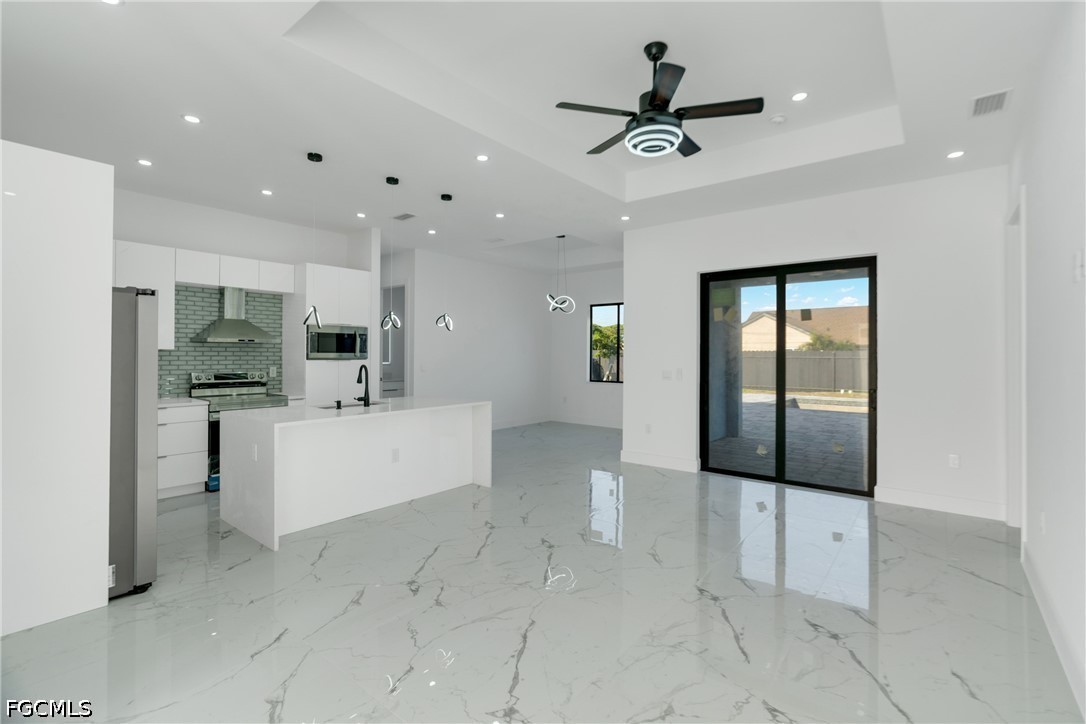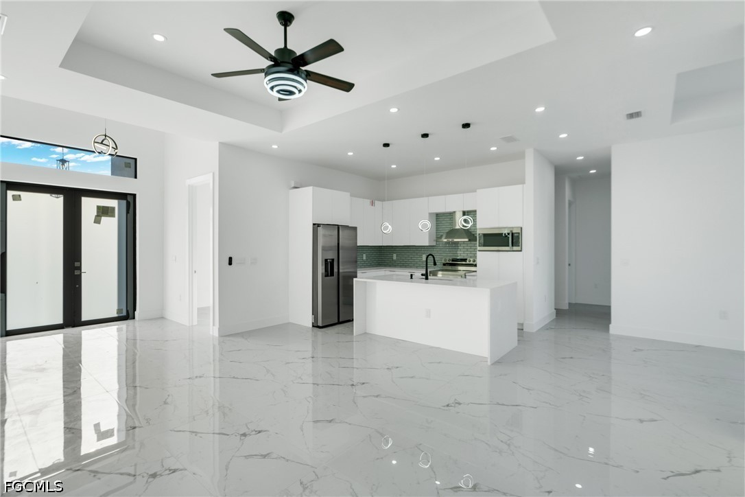 Step inside to discover a bright, open-concept layout featuring high-end porcelain tile flooring throughout, tray ceilings, and an abundance of natural light. The spacious living area flows seamlessly into a designer kitchen equipped with:
