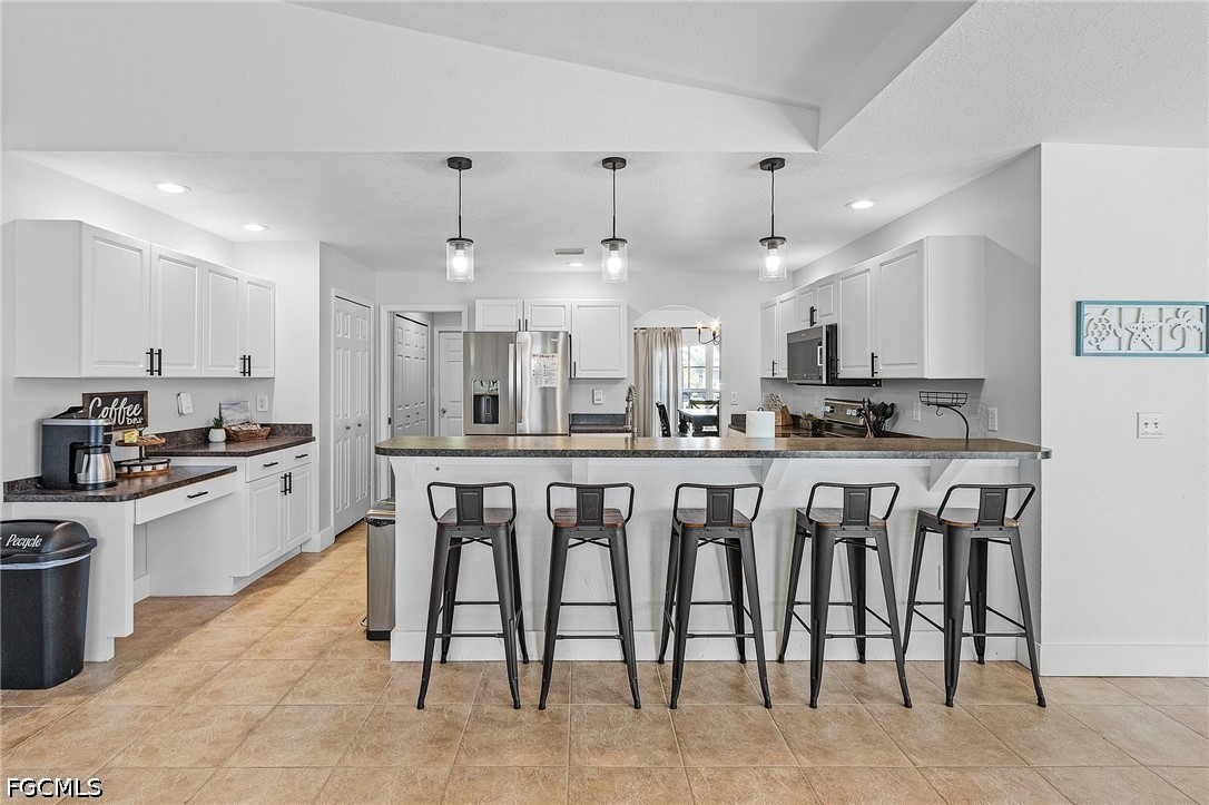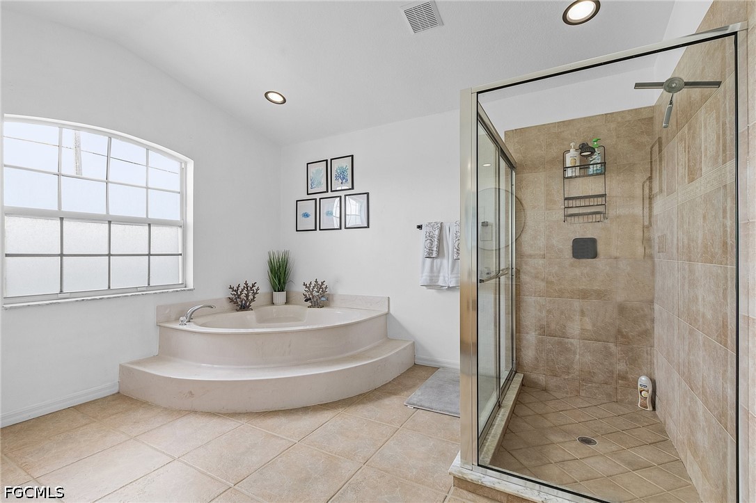 Inside features tile flooring throughout for both durability and elegance. The kitchen is equipped with stainless steel appliances and ample workspace, while the laundry room provides additional storage. The spacious primary suite offers a walk-in closet and an en-suite bathroom complete with dual sinks, a separate jetted soaking tub, and a walk-in shower, creating a comfortable and well-appointed retreat.