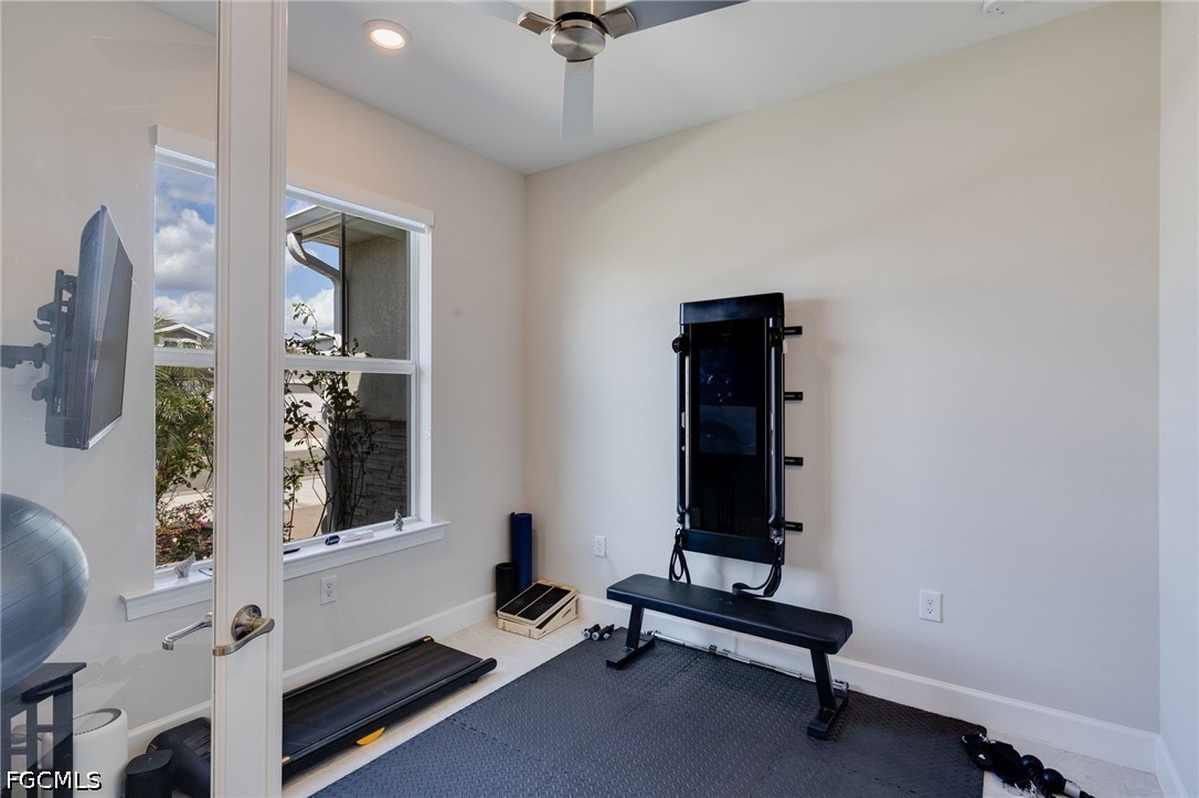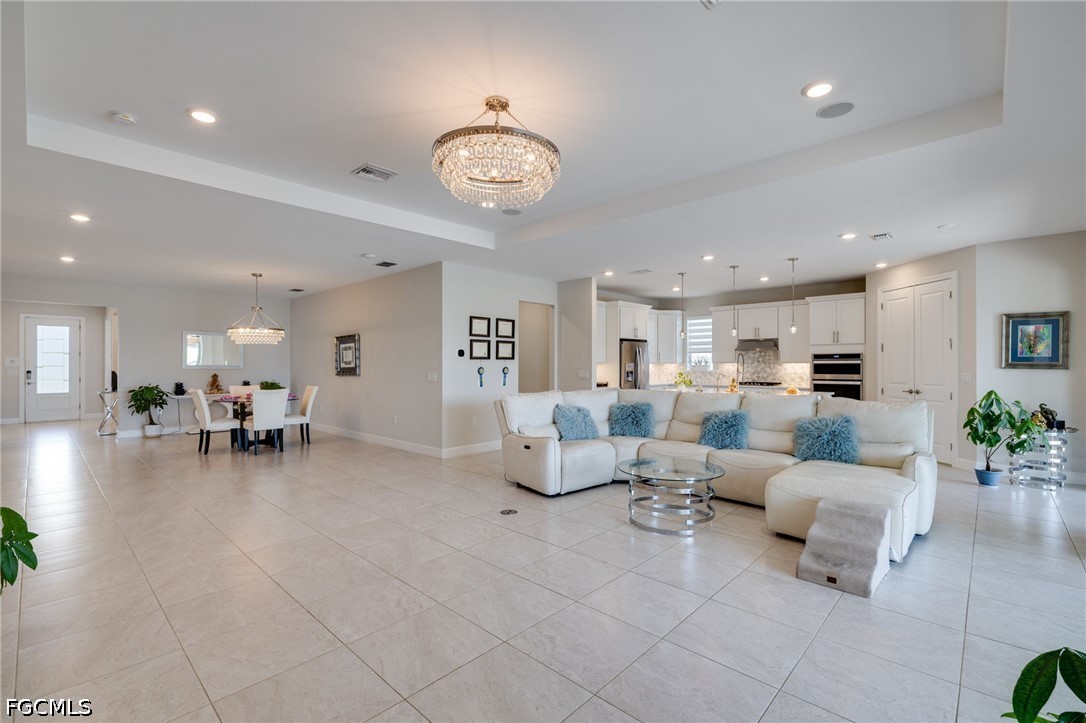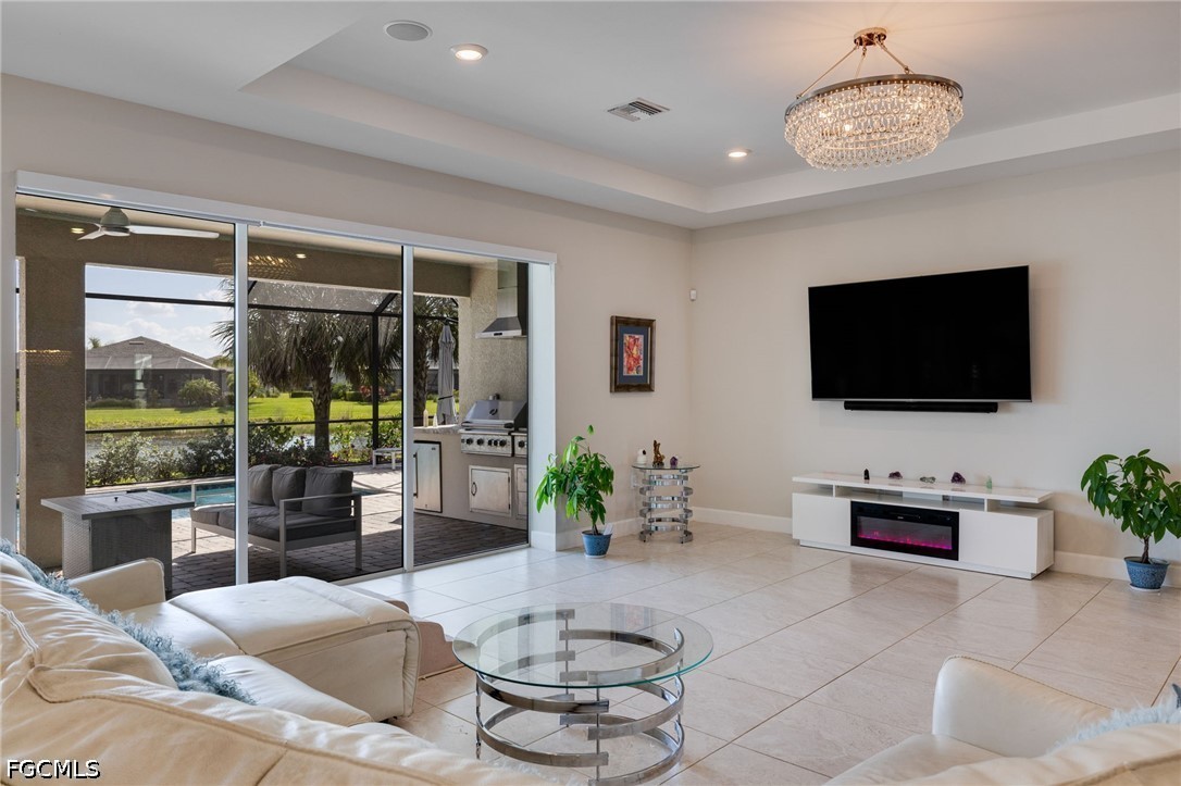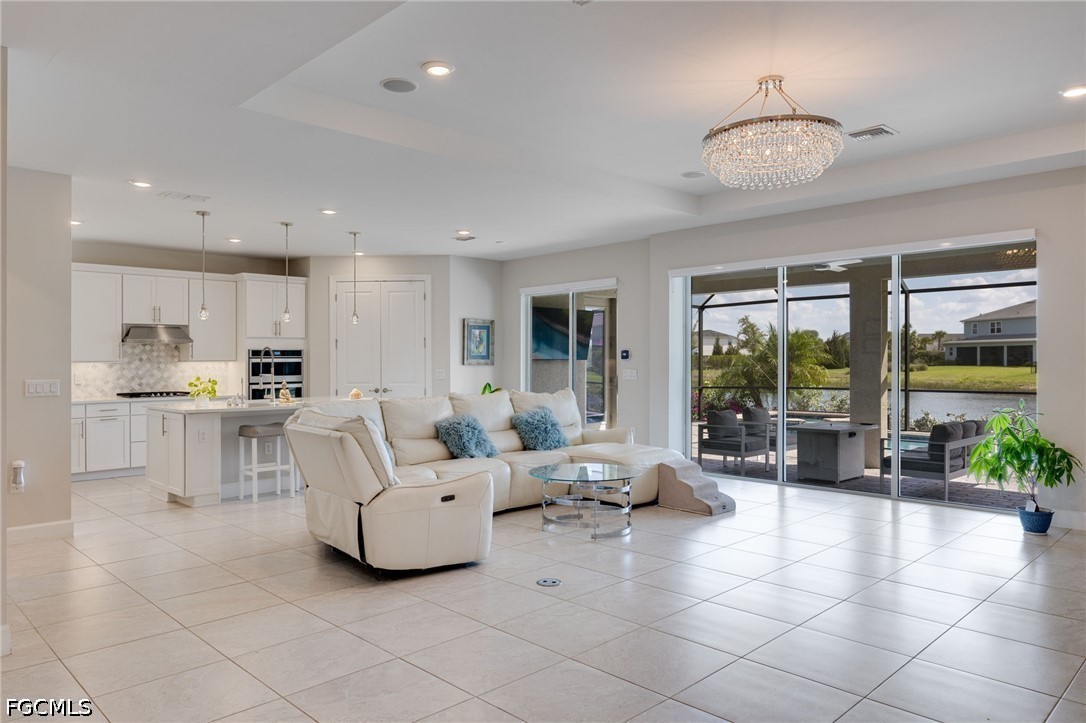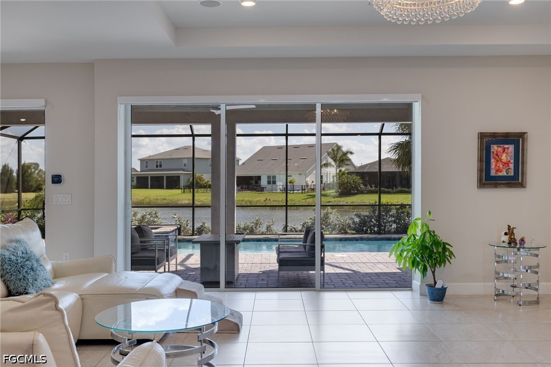 This single-story home features 3 spacious bedrooms, a dedicated office with smoked glass French doors, and 3.5 bathrooms, including a full pool bath designed for seamless outdoor access. The open-concept layout is finished with tile flooring throughout, creating a clean, modern aesthetic with low maintenance and high impact.
