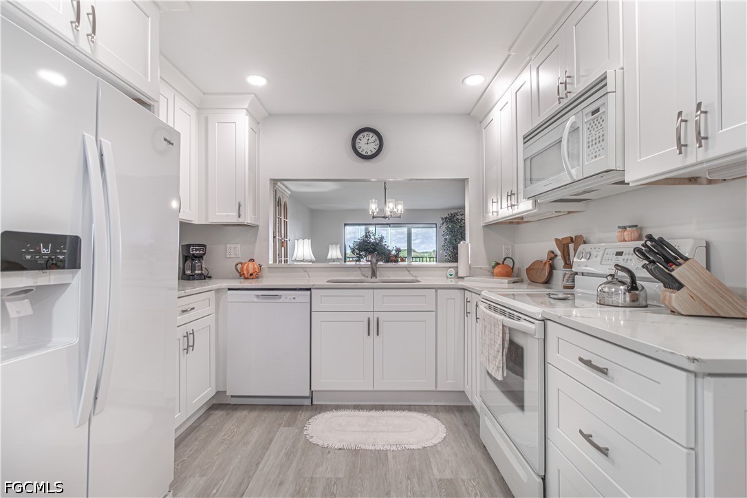 Move right in, this top floor Laurel Model has 1323 sq ft of living space with updated kitchen with white shaker soft close cabinetry and Quartz countertops. Some other updates include Luxury Vinyl Flooring throughout the condo New Impact Window in the primary bedroom, full size washer and dryer, 6 panel doors and new trim and Hardware, Electric Hurricane Shutter off the Lanai for your added protection and no popcorn ceilings. Screened-In Lanai has a beautiful view of 3 lakes and the golf course. A/C is 2020. CAR PORT SPACE #40 AND GOLF CART SPACE #L13 INCLUDED!!