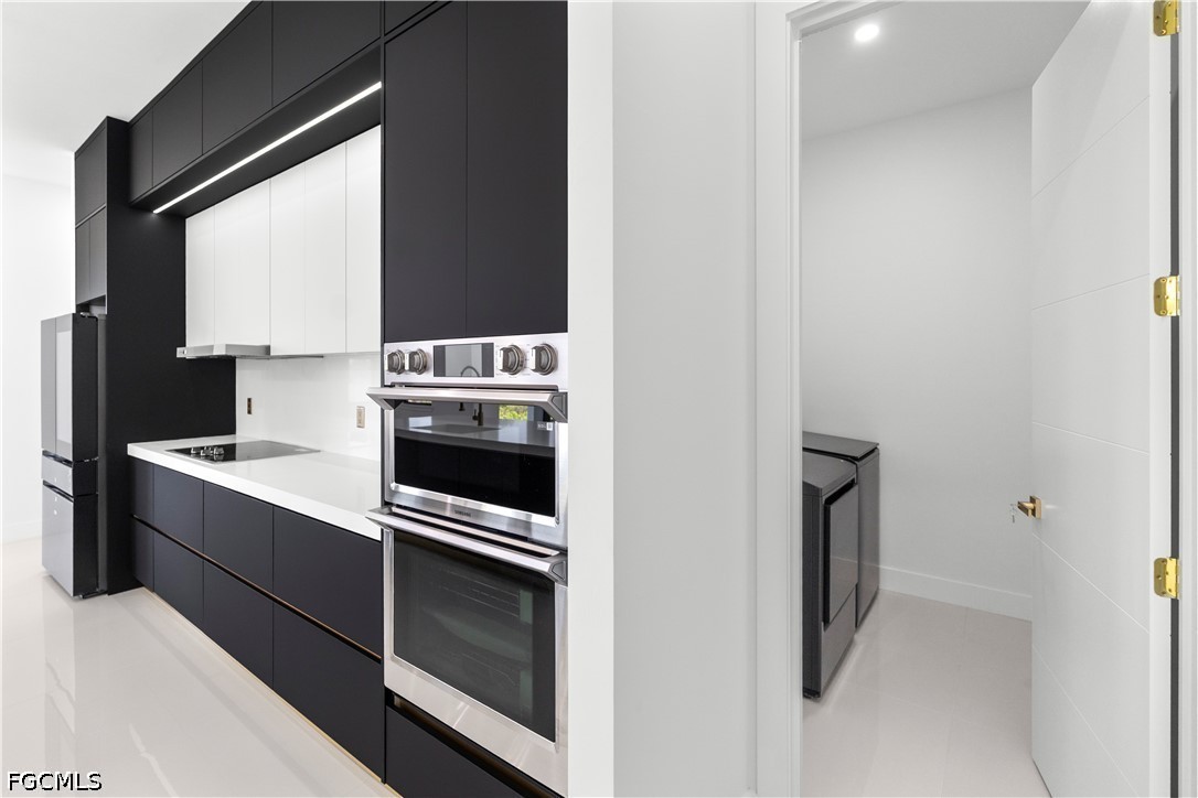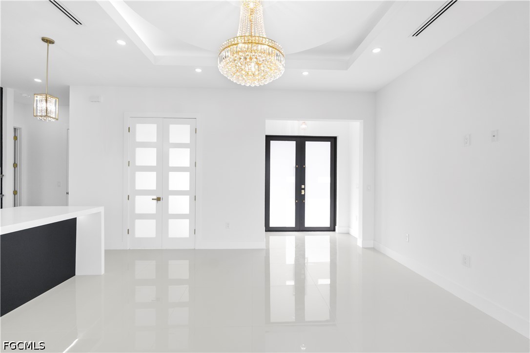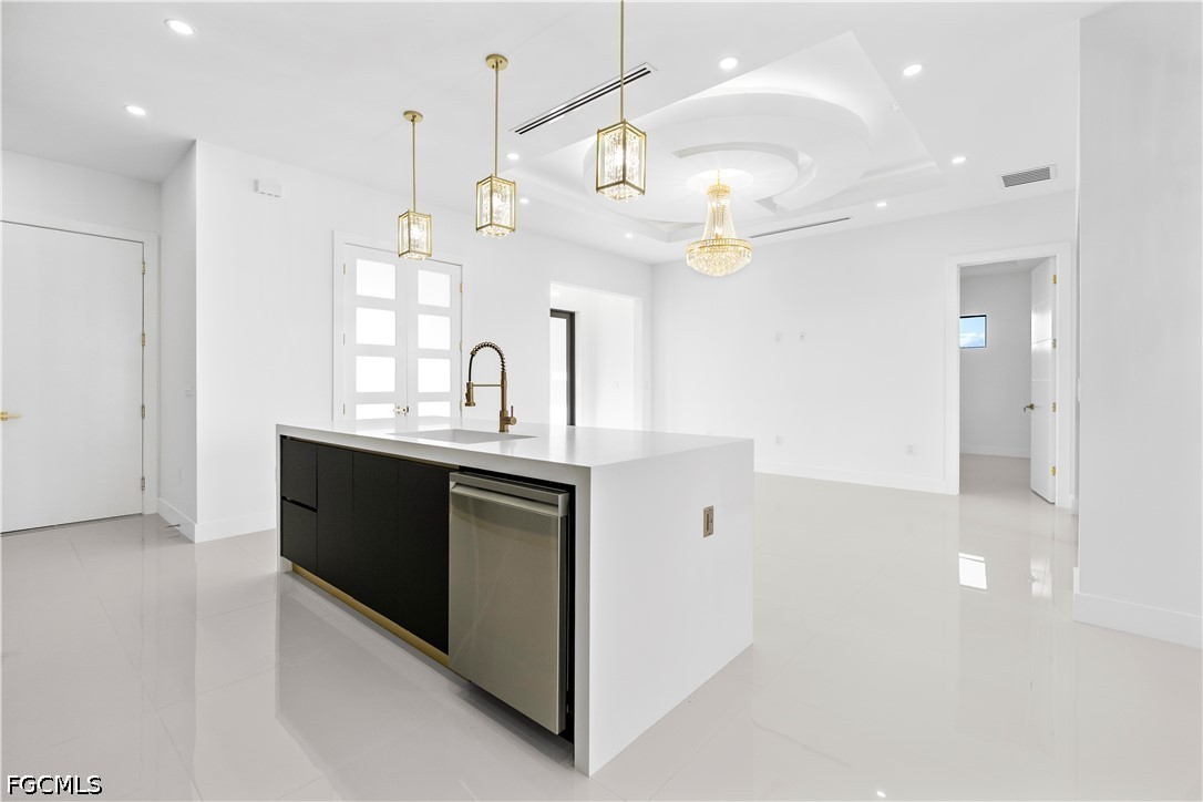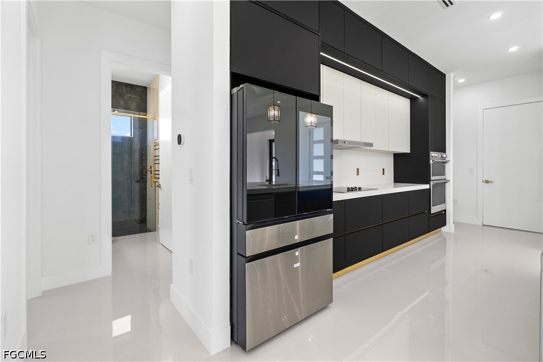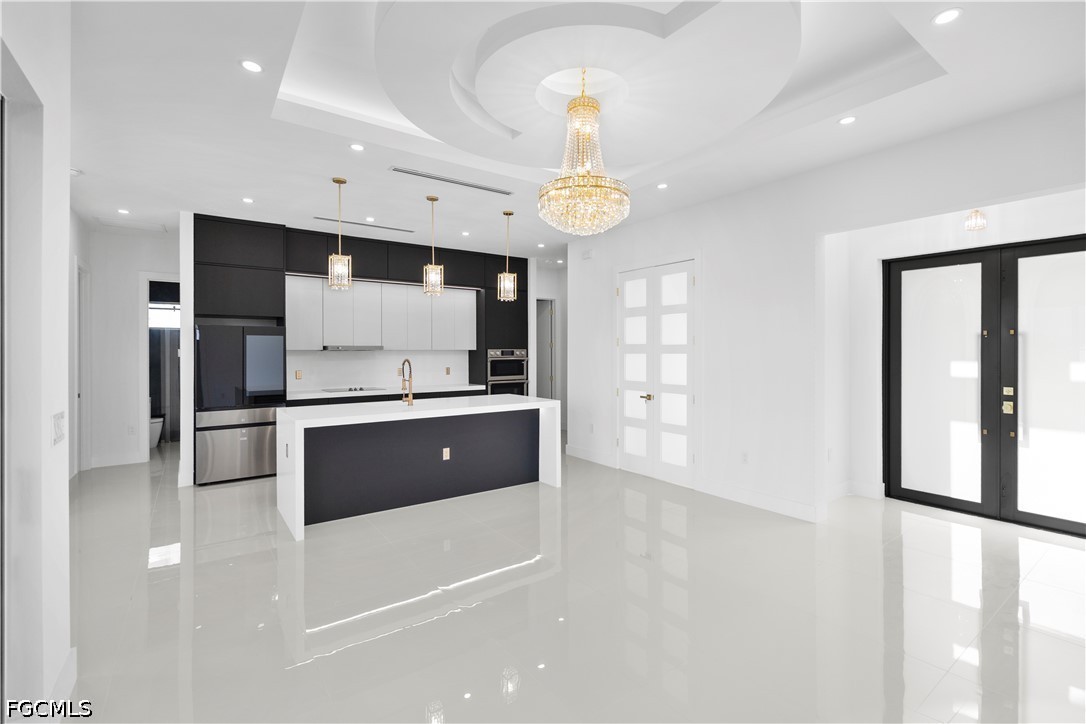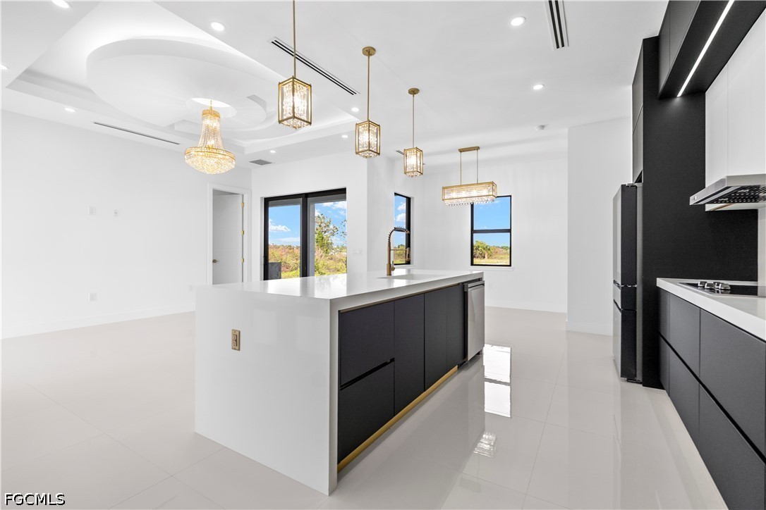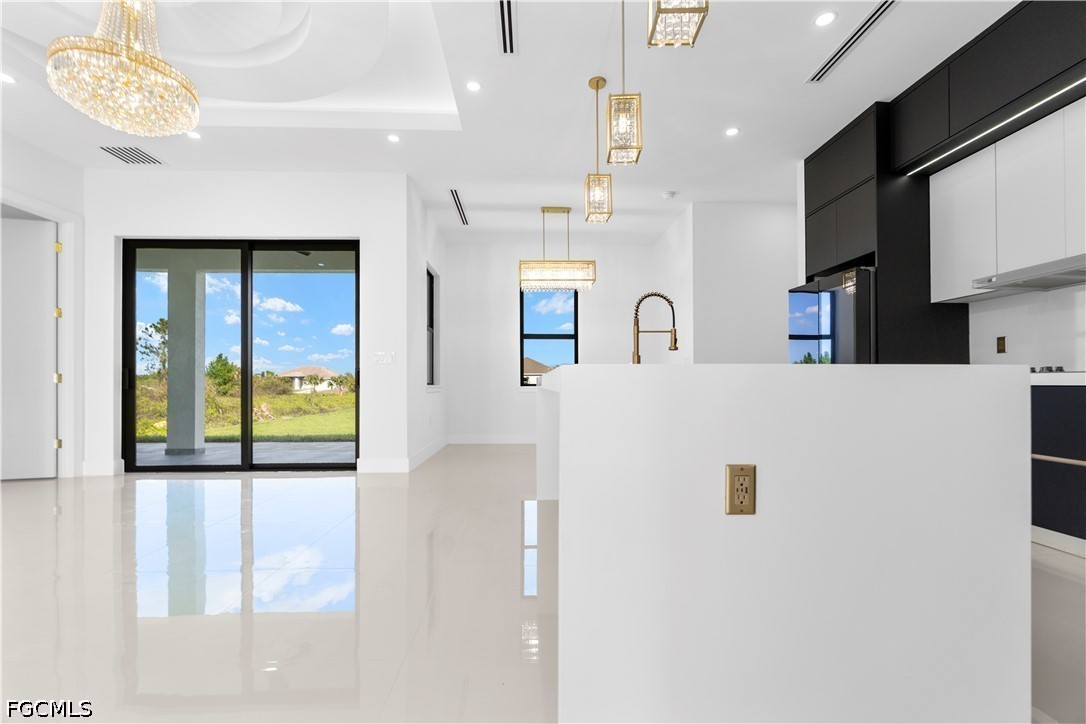 The home features an open-concept layout with tile flooring throughout, enhanced by custom ceiling designs and linear A/C vents that add a clean, contemporary look. The kitchen is fully equipped with built-in oven and microwave, cooktop, dishwasher, and custom cabinetry extending to the ceiling, providing both style and ample storage.
