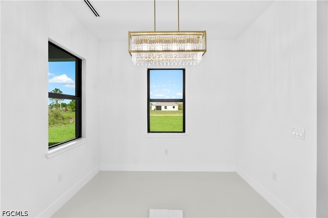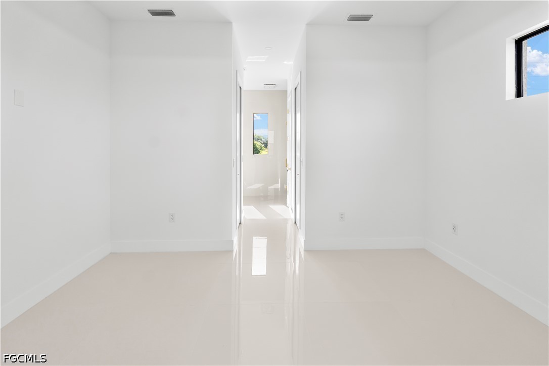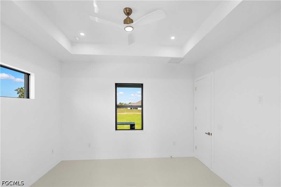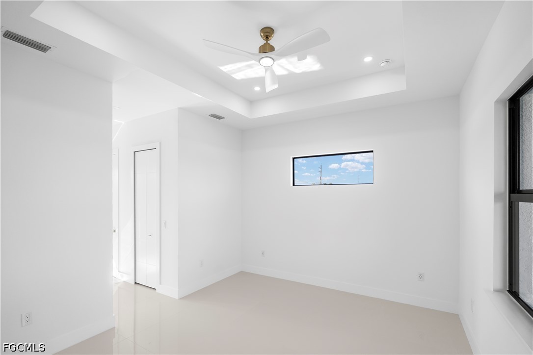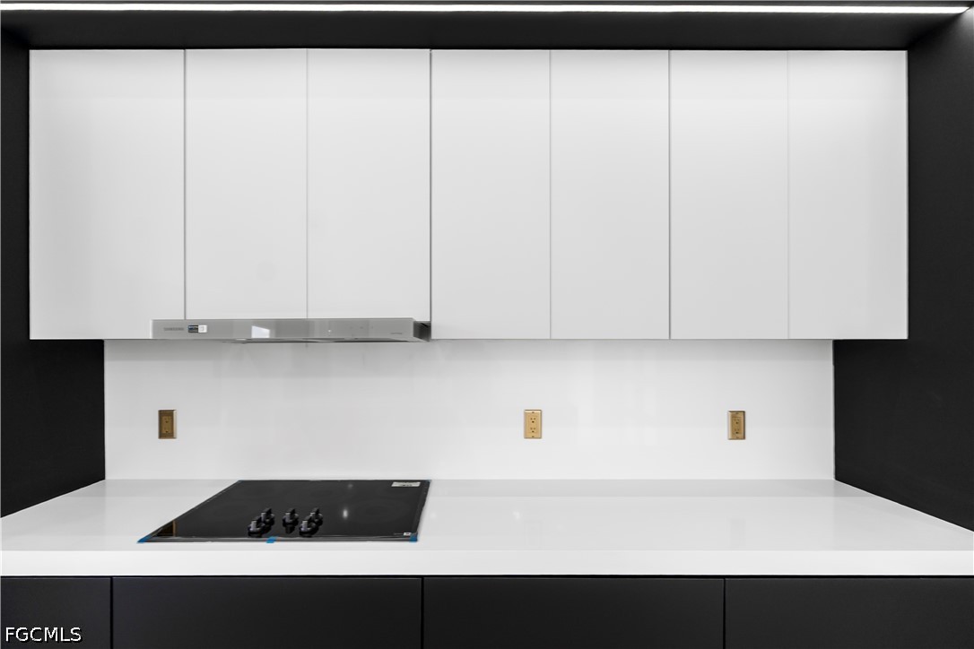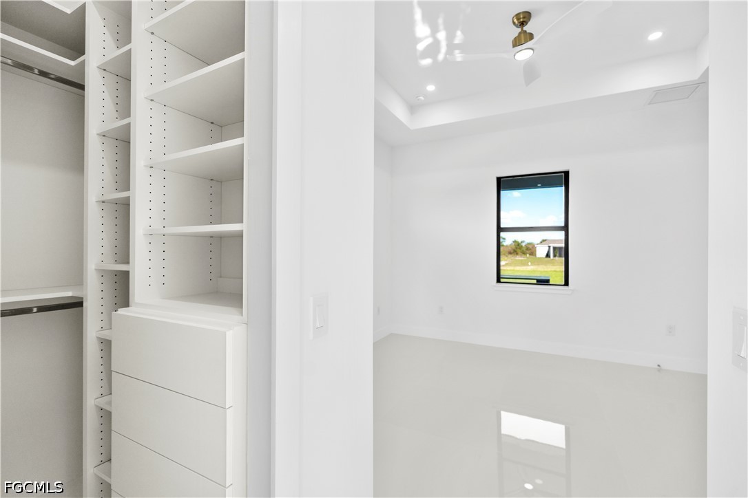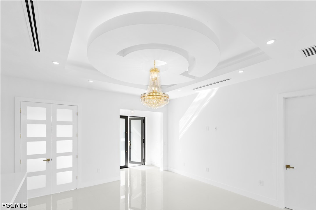 The home features an open-concept layout with tile flooring throughout, enhanced by custom ceiling designs and linear A/C vents that add a clean, contemporary look. The kitchen is fully equipped with built-in oven and microwave, cooktop, dishwasher, and custom cabinetry extending to the ceiling, providing both style and ample storage.