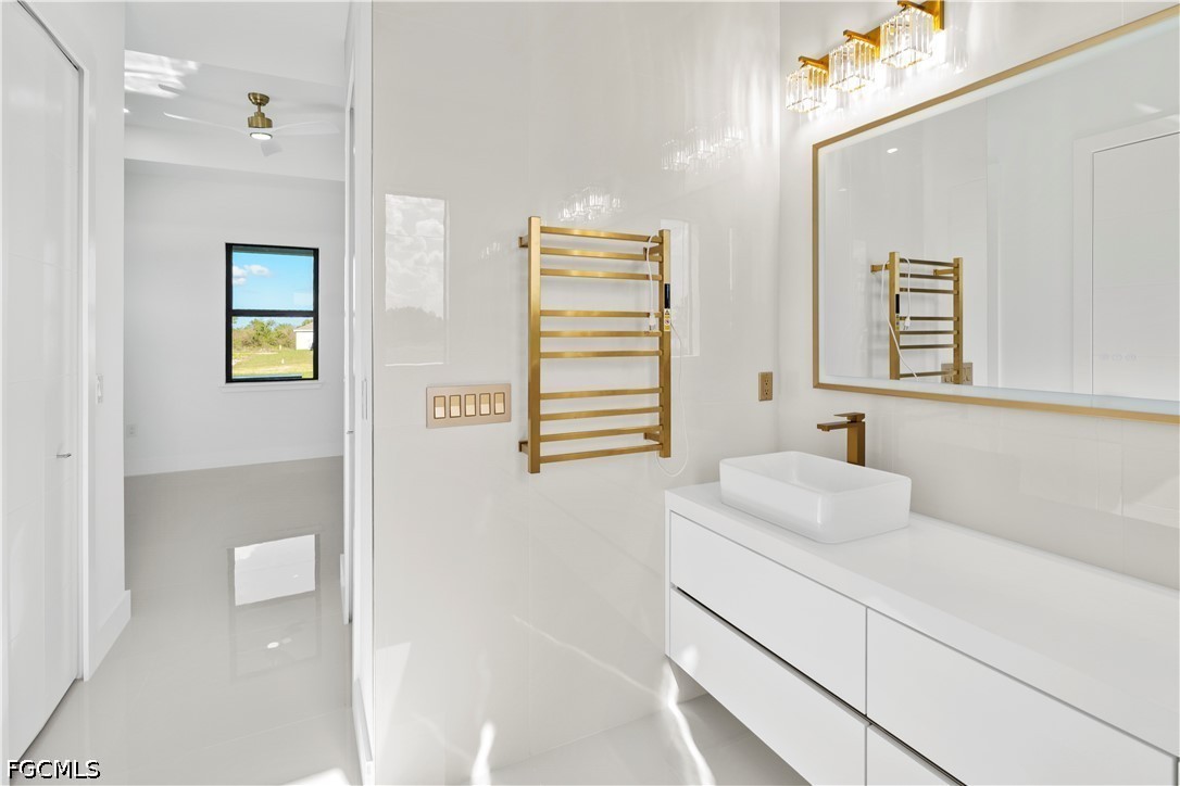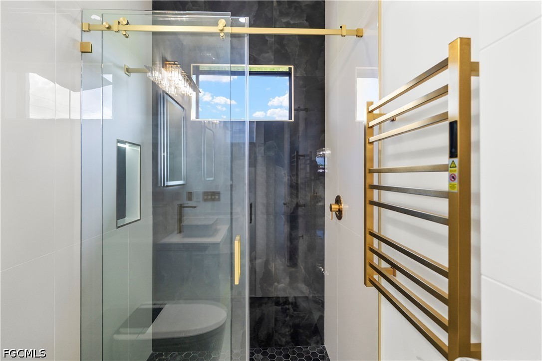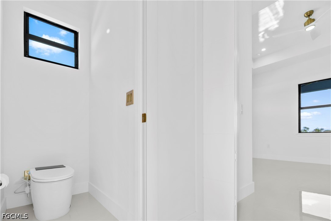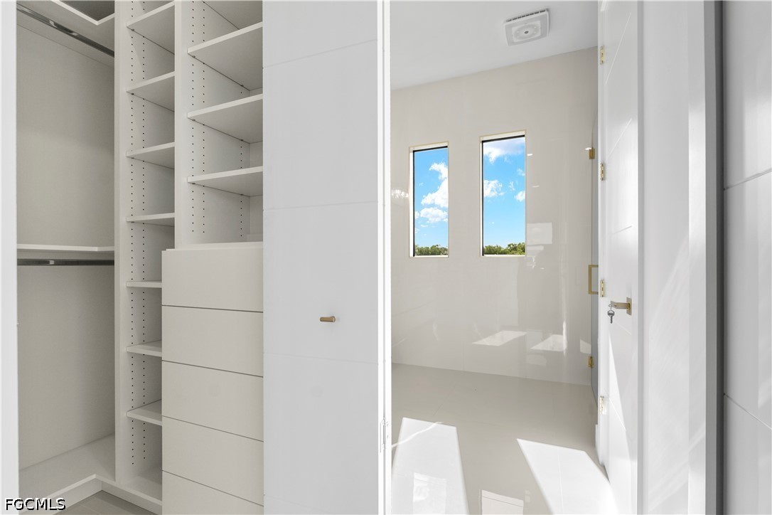 The primary suite offers a spacious retreat with two walk-in closets featuring built-in cabinetry and a spa-style bathroom with marble-like wall finishes, LED mirrors, modern fixtures, and an upgraded toilet. All bedrooms include custom-built closets, and the office/den includes a closet, making it suitable as an additional bedroom.