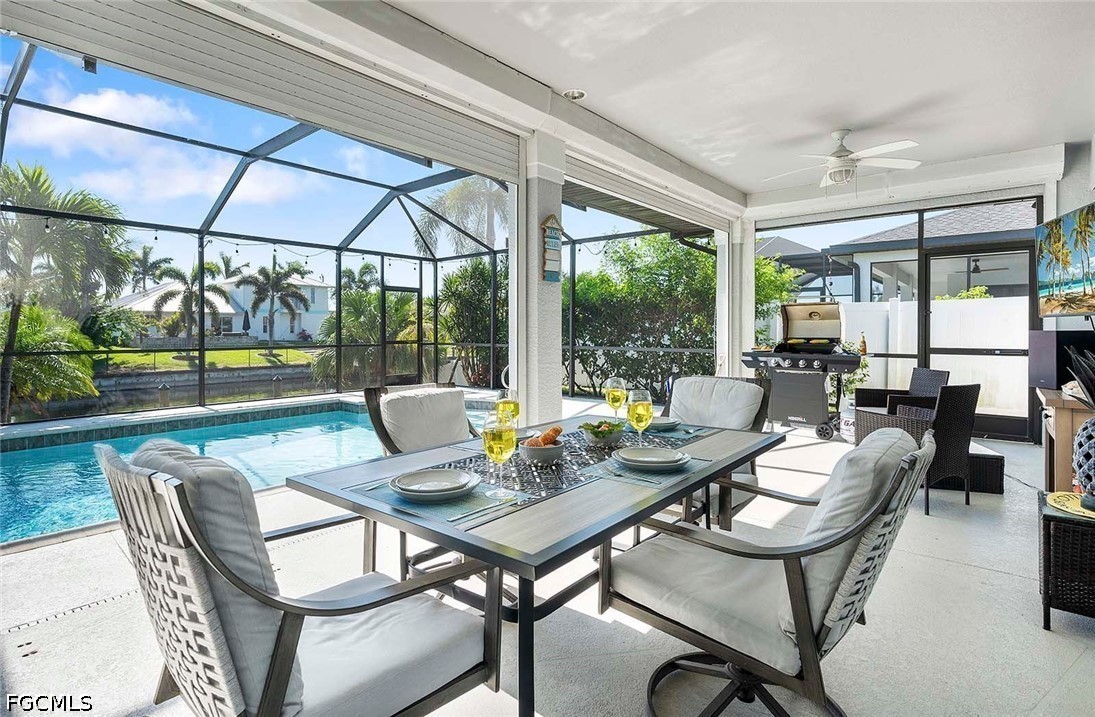 Outdoors, enjoy your own private oasis with an electrically heated swimming pool, perfect for year-round enjoyment. The lanai is equipped with electric roll-down shutters, providing added protection, convenience, and peace of mind. The outdoor space is perfect for dining, lounging, and taking in serene canal views.