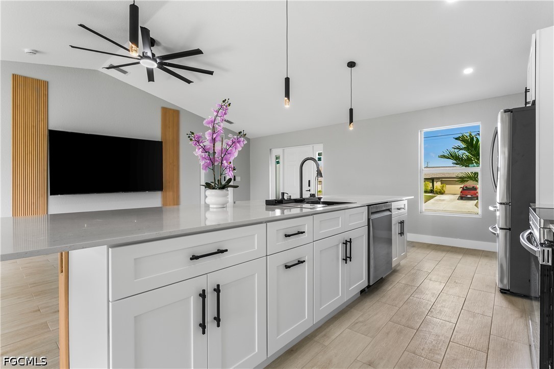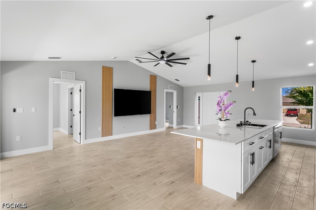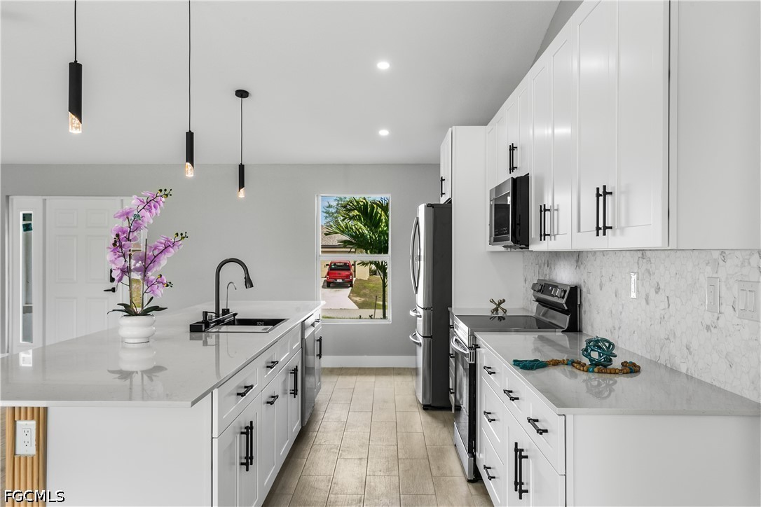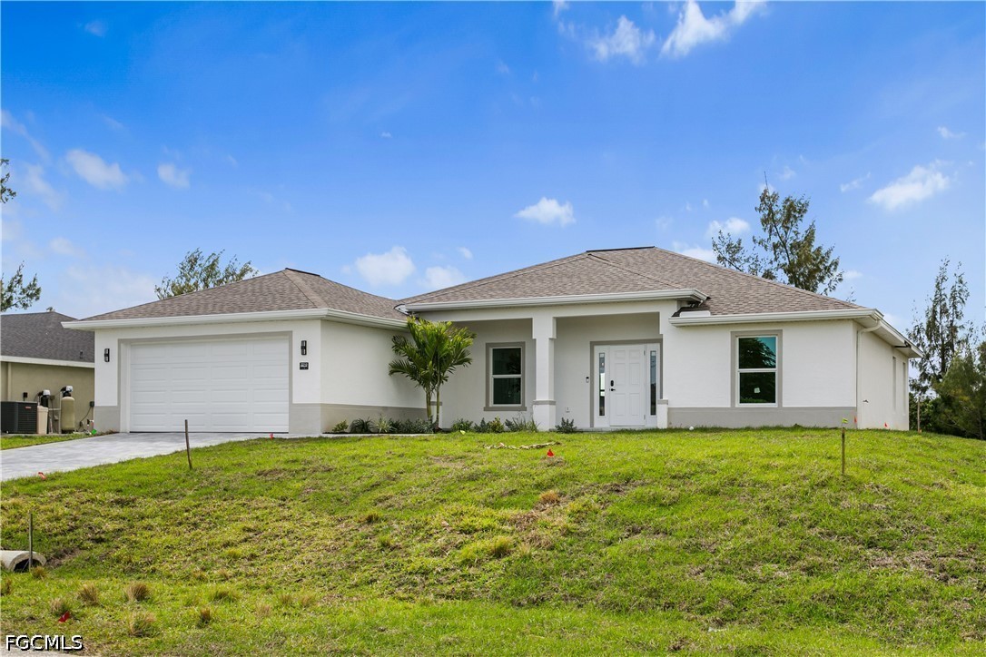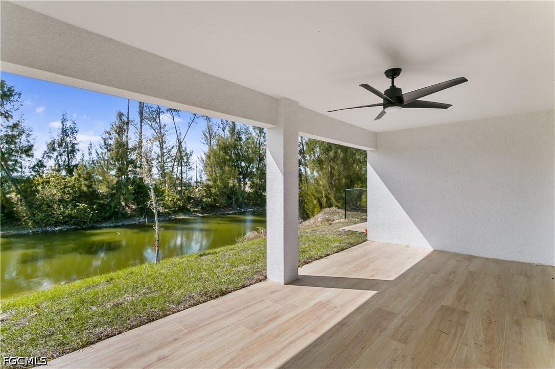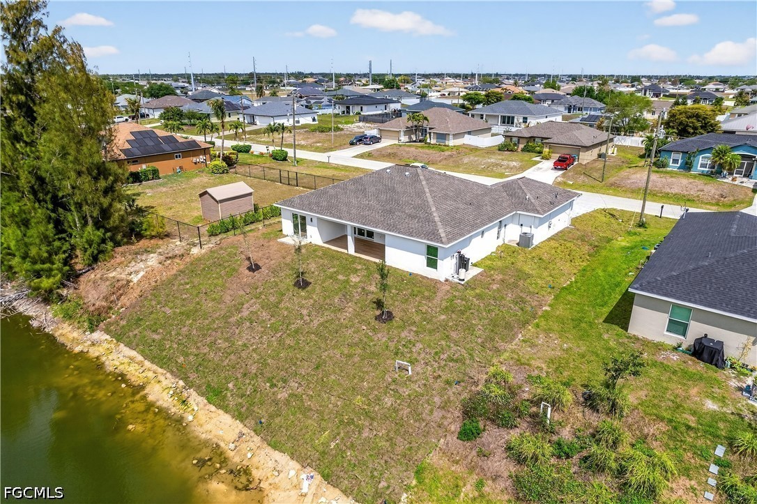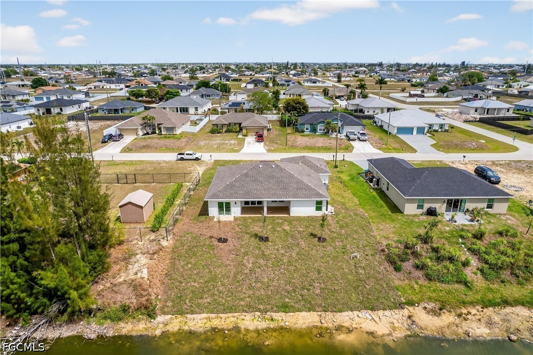 Welcome to your SWFL Paradise in NW Cape Coral—a move-in-ready new construction waterfront home on Valkyrie Canal, crafted for modern coastal living, comfort & lifestyle. Enjoy NO HOA, NO FLOOD INSURANCE, durable shingle roof & 2-CAR GARAGE, all ideally located with easy access to Kismet Pkwy W for daily convenience. Escape to your own “cabin in SWFL coastal paradise”, where modern comfort meets FL living. Set on a WEST-REAR EXPOSURE freshwater canal, this property delivers breathtaking sunset views and a peaceful waterfront setting perfect for kayaking, relaxing, or simply embracing Florida’s outdoor lifestyle. The covered lanai with ceiling fan creates the ideal space for year-round entertaining, morning coffee, or evening unwinding, while the expansive backyard offers room to build your dream pool or outdoor oasis. Inside, a bright open-concept floor plan features light neutral tile flooring throughout, impact-resistant windows and sliding doors, and a 12-ft vaulted ceiling that enhances space and natural light. The elegant front entry with dual glass sidelights welcomes you into a sophisticated yet inviting interior. The chef-inspired kitchen is the heart of the home, showcasing an oversized quartz island, white shaker cabinetry paired with warm wood-tone accents, and modern black hardware for a refined coastal look. A commercial-style matte black pull-out faucet with pot filler functionality, undermount sink, and sleek finishes elevate both design and performance. The kitchen is fully equipped with stainless steel appliances, including a French door refrigerator, smooth-top range, built-in microwave, and dishwasher, blending style with everyday functionality. The dining area is enhanced by vaulted ceilings, recessed lighting, and a large window overlooking the outdoor space, complemented by custom built-in cabinetry for added storage and upscale appeal. Retreat to the spacious primary suite featuring sliding doors to the lanai, a walk-in closet, and a spa-inspired bathroom with floor-to-ceiling tiled walk-in shower, dual quartz vanities, matte black fixtures, and an electric bidet toilet. A split floor plan provides privacy, including a second suite with patio access, additional guest bedrooms, and a versatile flex room ideal for office, den, or studio. This property offers both tranquility and accessibility, with quick connections to US-41 and I-75. Enjoy easy day trips to Port Charlotte, Venice, Sarasota, or south to Fort Myers, Naples, and Marco Island. Spend weekends at Boca Grande, Lovers Key, or Sanibel Island, and experience waterfront dining and sunsets at Fishermen’s Village. Convenient access to RSW International Airport and Punta Gorda Airport makes travel effortless. Whether you’re entertaining, relaxing by the water, fishing, or embracing the ultimate Southwest Florida lifestyle, this home offers the perfect blend of luxury, functionality, and location. Schedule your private showing today and discover your piece of paradise!