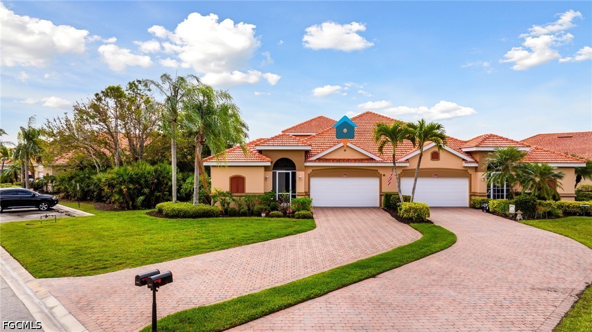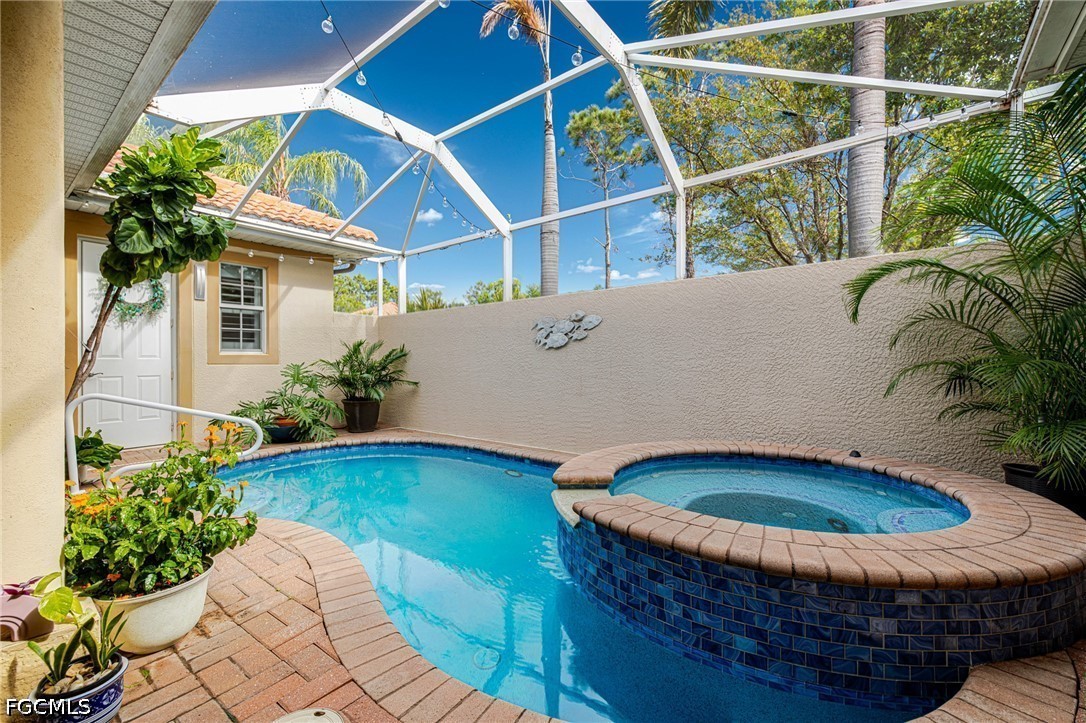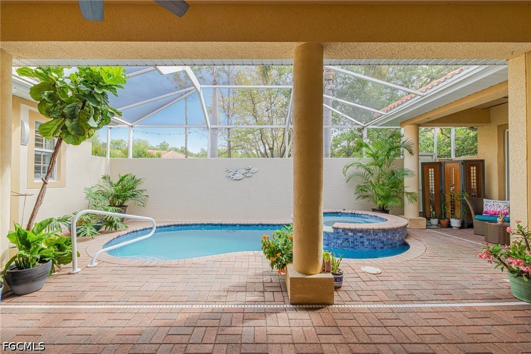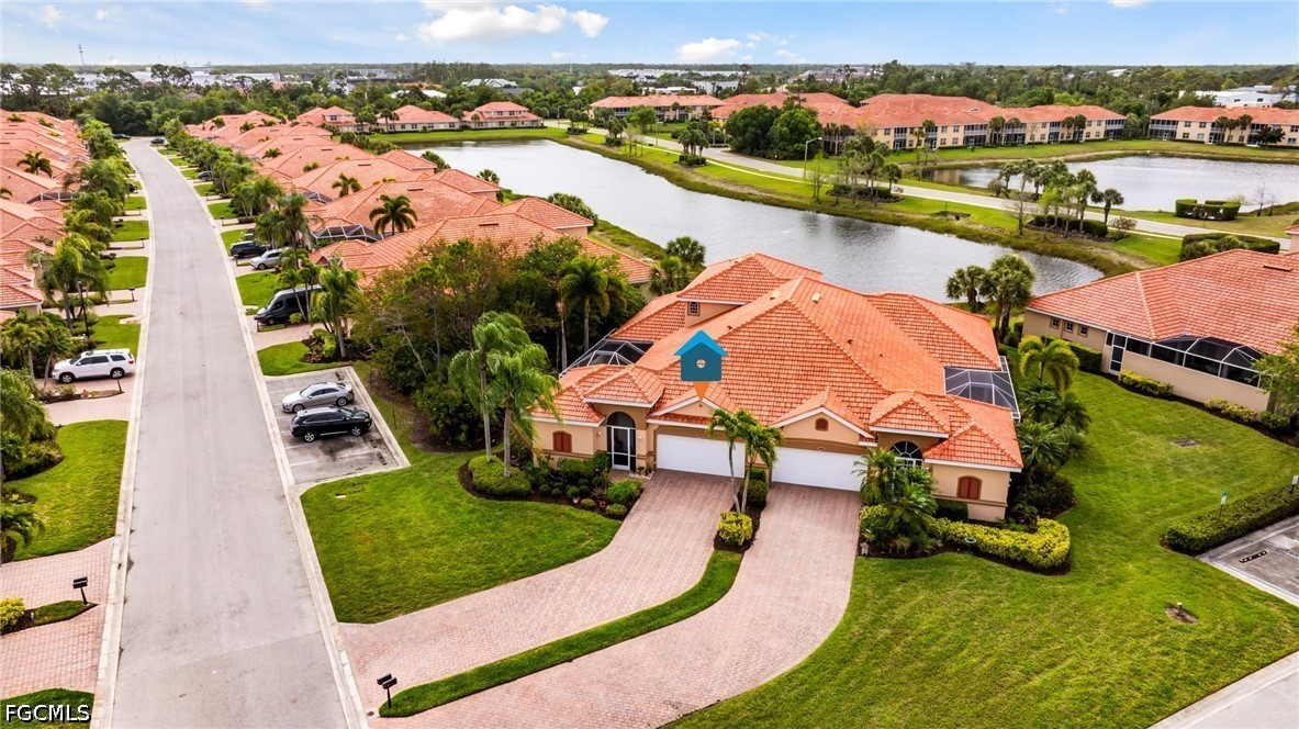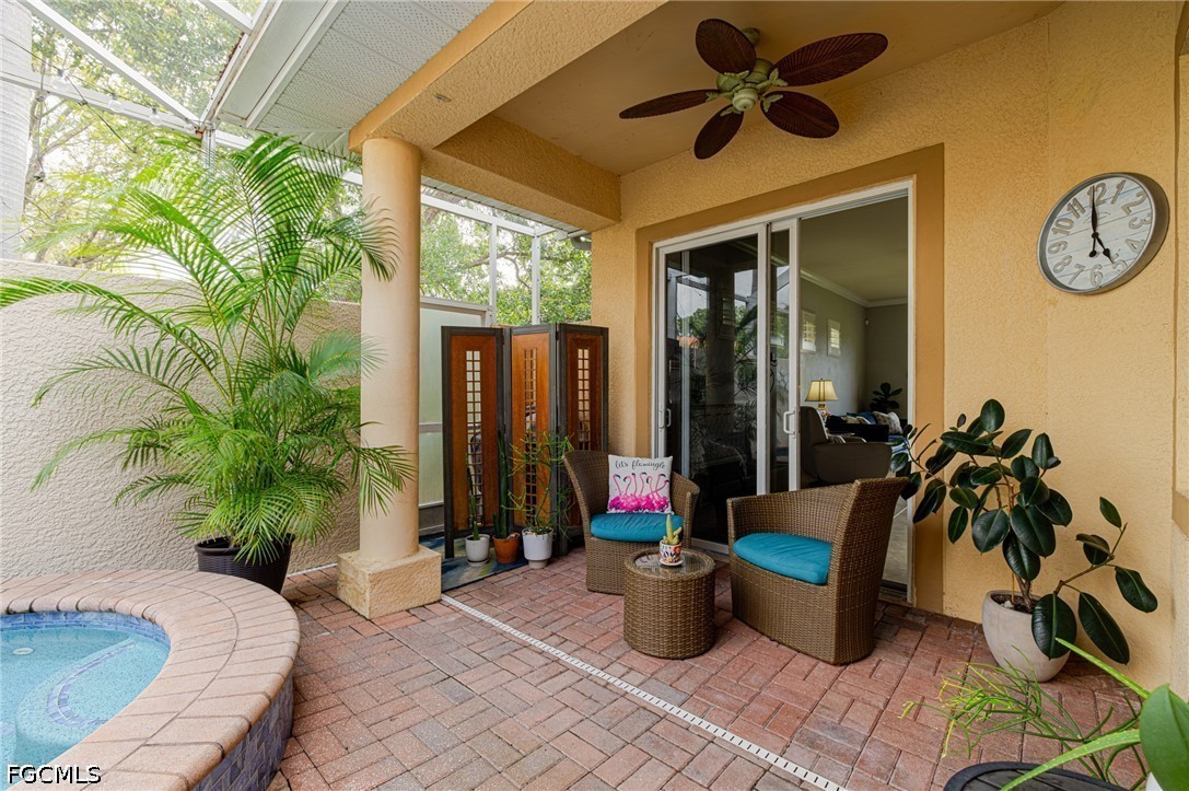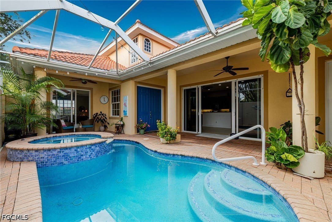 Experience the ultimate Florida lifestyle in this stunning 4-bedroom, 4.5-bathroom courtyard-style home. Designed for those who love to entertain, the heart of this residence is a private, screened-in courtyard featuring a waterfall and a 5-person spa—your own tropical oasis. This spacious end-unit offers over 2,700 sq. ft. of living space with a flexible floor plan, including a private guest cabana perfect for visitors or a home office.Inside, enjoy high-end finishes like granite countertops, a large island kitchen with a walk-in pantry, and a primary suite on the main level featuring tray ceilings and a large walk-in closet. Additional highlights include impact-resistant windows/doors for peace of mind along with a generator and a 2-car garage. Located in a gated community just minutes from Bell Tower Shops, fine dining, and Gulf beaches. Community amenities include a resort-style pool, a second pool, hot tubs, tennis courts, pickle ball courts and 3+ miles of walking trails. Not in a FLOOD ZONE will give you peace of mind and save on insurance!