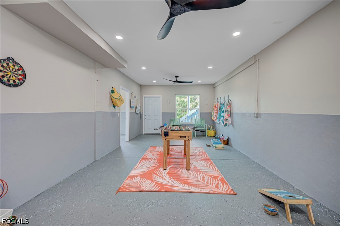 The outdoor space is designed for fun and relaxation, featuring a vibrant Florida-style entertaining area perfect for hosting guests, with room for a tiki bar vibe and room for a pool, lounging, and dining. Inside, additional flexible space can be used as a game room or bonus entertainment area, adding even more appeal for personal enjoyment or rental guests.