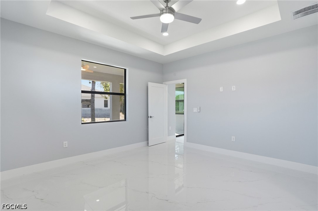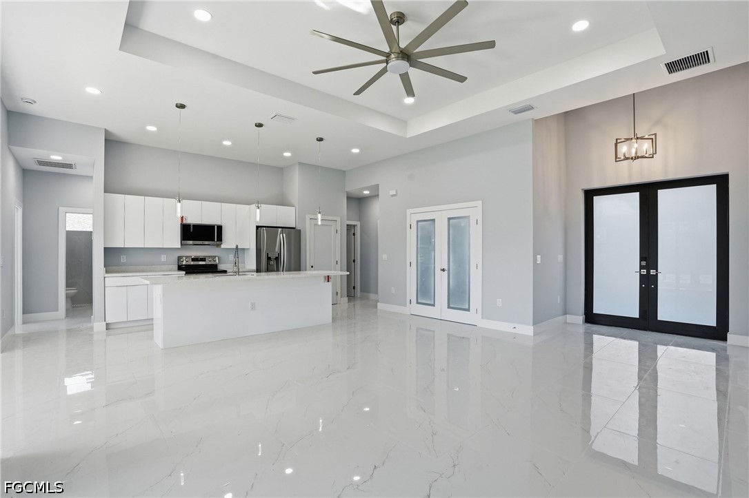The flexible den provides the perfect space for a private office, study, guest room, or media lounge, while elegant tray ceilings add height and architectural charm. The well-appointed kitchen features stainless steel appliances, clean contemporary finishes, and excellent connection to the main living spaces.