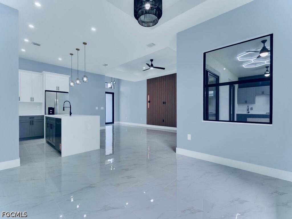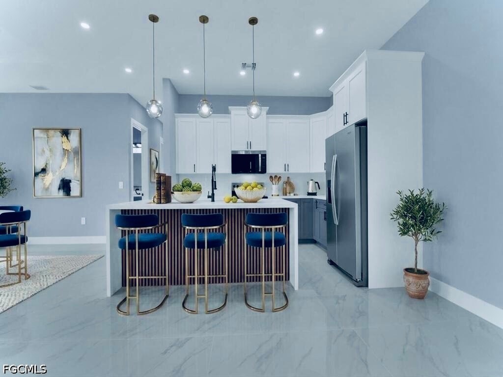 The home highlights impressive oversized porcelain tile throughout, gorgeous QUARTZ rainfall countertops & backsplash, and an inviting illuminated ACCENT wall. The kitchen boasts STAINLESS STEEL appliances and admirable two-tone SOFT-CLOSE SHAKER cabinets with crown molding.