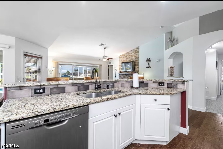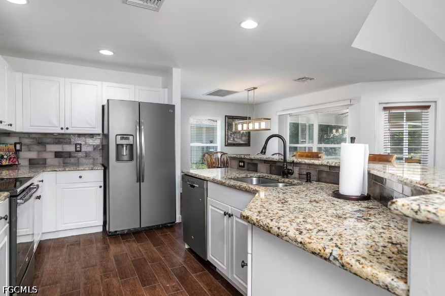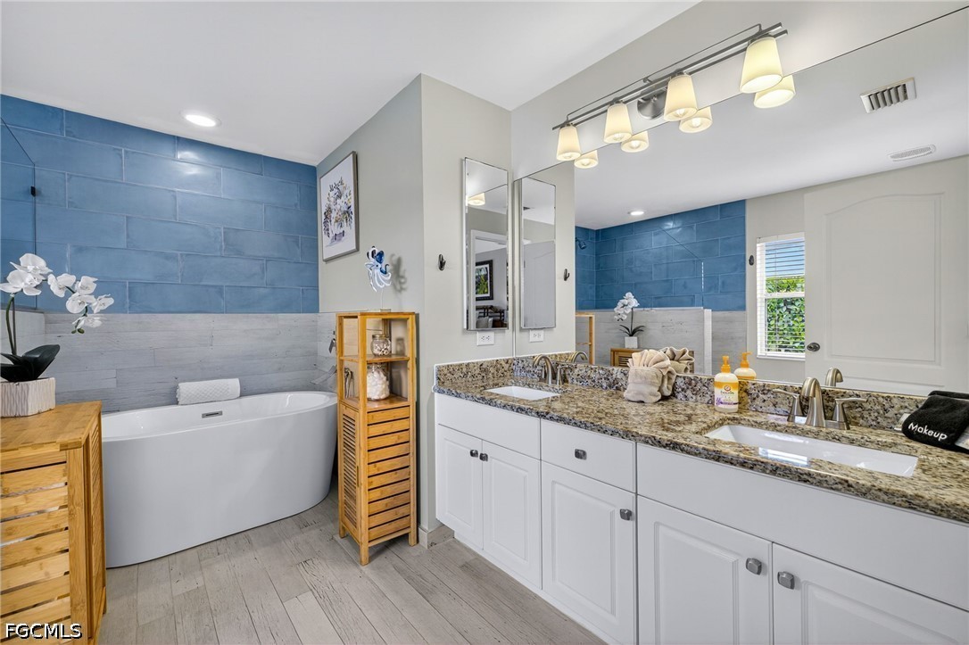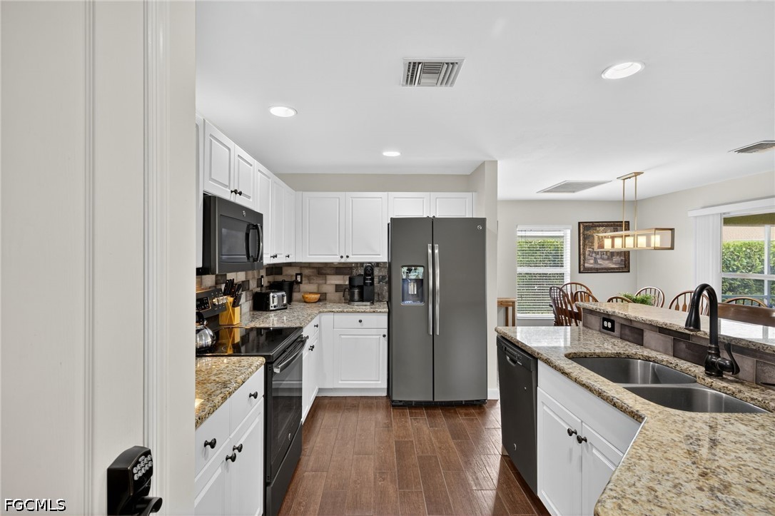 Open-concept layout features a modern kitchen with granite countertops, center island, stainless steel appliances, and recessed lighting overlooking the great room with stone fireplace, vaulted ceilings, and dark wood-style floors. The owner's suite offers a large walk-in closet and spa-inspired bath with dual vanities, soaking tub, and walk-in shower. The den is perfect as a home office or 4th bedroom.